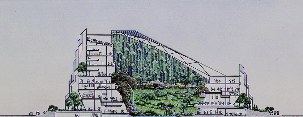 Climatically similar to Siberia, Hokkaido's image is that of an ever present winter in which snow seems somehow to fall horizontally. Ambasz's design for a new two and a half acre department store creates a perpetual spring like garden within this otherwise bleak environment where people can gather under a glass skylight to look at plants, listen to water cascades and stroll along walkways in the courtyard around which the building is organized. The local building ordinance only typically allows 23,000 sq.ft. of retail in this area but, as a reward for the civic mindedness of this building, the client was allowed to construct over 58,000 sq.ft. of shopping, thereby significantly increasing the profitability of the entire venture.
