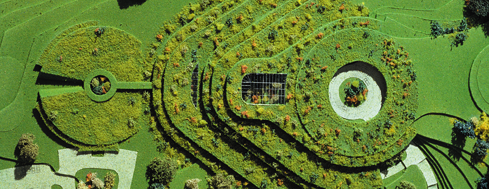 The Winnisook Lodge is located within the Catskill Park in upstate New York on a 2,000-acre private golf ing. community on the slopes of Belleayre Mountain. This 150-room luxury hotel Will be the centerpiece to a resort comprised of an 18-hole golf course, private home and golf clubhouse. The site for the hotel is a wooded ridge stretching from the summit of Belleayre Mountain just below the 18th hole. It has exposure to the north, east and south sides of the ridge offering panoramic views of the surrounding landscape. In order to obtain approval with the many state and local governments as well as the many environmental groups opposed to developing the area, Emilio Ambasz was asked to design a 226,000 sq.ft. building that is virtually invisible within the natural landscape while taking advantage of each possible vista to make it a premier hotel destination. To achieve this, Ambasz has designed the project into two buildings: the main building for the hotel with the restaurants, banquet facility and support facilities and a second building housing the spa and fitness center and the golf clubhouse. The main building is organized on five levels, each conforming to the natural terrain to effectively integrate the mass into the landscape with minimal excavation while approximating the original profile of the ridge. Each floor conforms to the natural contour of the ridge and steps back at each level creating roof terraces. The entire building is then blanketed with native plants which essentially make it invisible. The spa and golf clubhouse are situated in a one story structure reached from the lowest floor of the hotel. Ambasz has placed the lobby at the highest floor where guests enter into a circular motor court to reach the reception and restaurants. Arriving guests are offered breathtaking views of the surrounding mountains as they check in or while dining in two restaurants or sipping drinks in the lounge. Patios on the roof terrace offer guests the best views. The lobby continues down one level to a pre-function lounge near the banquet functions. Here, a ballroom for 200 people and three 350 sq.ft. conference rooms are located. From these spaces doors open to the outside expanding the events onto the roof terrace. At the core of the hotel is a five story skylit atrium filled with plants and waterfalls. The lower floors are reached by descending through the atrium in glass elevators. The atrium expands toward the bottom into a large space where guests may fully experience this interior landscape year-round. At each of the four guest floors, elevators open onto generous sitting areas facing the golf club and spa at the base of the hotel. These intimate spaces provide guests a chance to orient themselves within the hotel and to walk outside onto the roof terraces. From each sitting area wide corridors connect the guestrooms that wrap around the atrium. To optimize views, the guestrooms have lofty ceilings and are divided onto two levels: the sleeping area and bathroom are located a few steps above a sitting area. From their beds guests have unobstructed views of the mountains. Each room has a private terrace facing the view. At the base of the hotel lie the health spa and golf club in a structure that is reachable both from within the hotel by a covered walkway and by a. separate public entrance from a driveway. These functions are housed under a sloped, landscaped roof that is circular in plan.